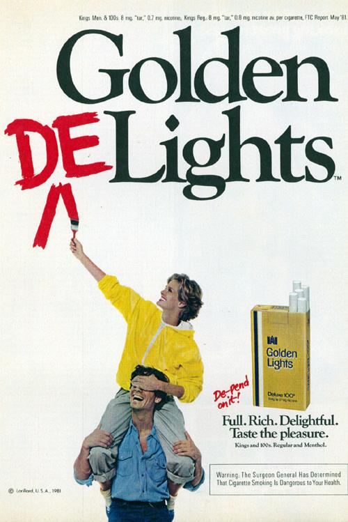 Ad for Golden Lights found in Family Circle March 16, 1982. Image is of a woman on na mans shoulders. She is painting the letters D and A to make the ad say, "Golden Delights."