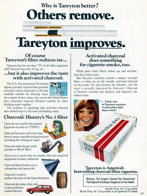 Ad found in Family Circle November 1976 and Woman's Day December 1976."Why is Tareyton better? Others remove. Tareyton improves." Ad provides a brief history of how charcoal has been used as a filter.