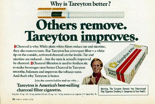 Ad found in Family Circle March 1976. "Why is Tareyton better? Others remove. Tareyton improves."