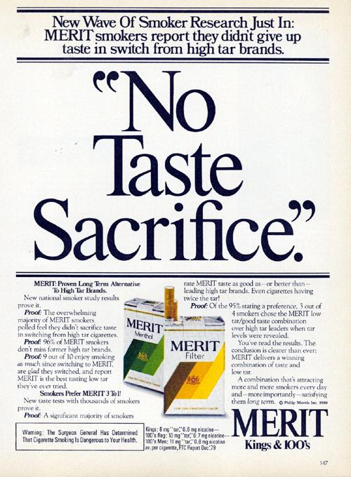 Ad found in Glamour June 1980. "new wave of smoker research just in: MERIT smokers report they didn't give up taste in switch from high tar brands. 'No Taste Sacrifice.' Merit: Proven long term alternative to high tar brands."