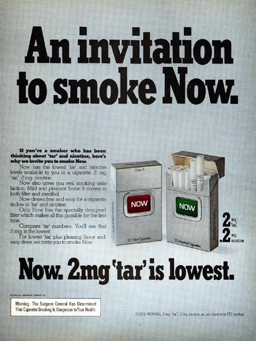 Ad found in Woman's Day September 1976. "An invitation to smoke Now. if you're a smoke who has been thinking about 'tar' and nicotine, here's why we invite you to smoke Now. Now has the lowest 'tar' and nicotine levels available to you in a cigarette, king-size or longer. 2mg. 'tar' 2mg. nicotine."