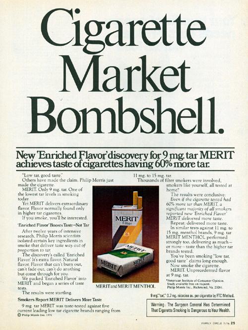 Ad found in Family Circle July 1976. "Cigarette Market Bombshell.'Enriched Flavor' discovery for 9mg. tar MERIT achieves taste of cigarettes having 60% more tar."