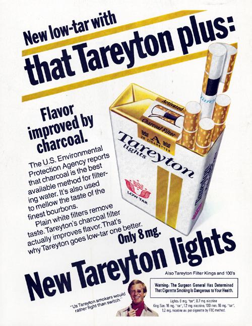 Ad for Tareyton Lights found in Playboy April 1977."New low-tar with that Tareyton plus: Flavor improved by charcoal. The U.S. Environmental Protection Agency reports that charcoal is the best available method for filtering water. It's also used to mellow the taste of the finest bourbons. Plain white filters remove taste. Tareyton's charcoal filter actually improves flavor. That's why Tareyton goes low-tar one better. Only 8mg."