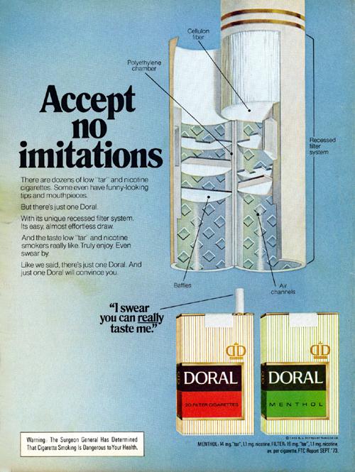Ad found in Family Circle February 1974. "Accept no limitations. There are dozens of low "tar" and nicotine cigarettes. Some even have funny-looking tips and mouth pieces. but there's just one Doral. With it's unique recessed filter system. Its easy, almost effortless draw. And the taste low "tar" and nicotine smokers really like. truly enjoy. Even swear by. Like we said, there's just one Doral. And just one Doral will convince you."