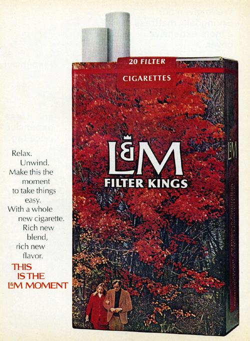 Magazine ad for L&M cigarettes found in McCall's February 1971. "Relax. Unwind make this the moment to take things easy. With a whole new cigarette. Rich new blend, rich new flavor. This is the L&M Moment."