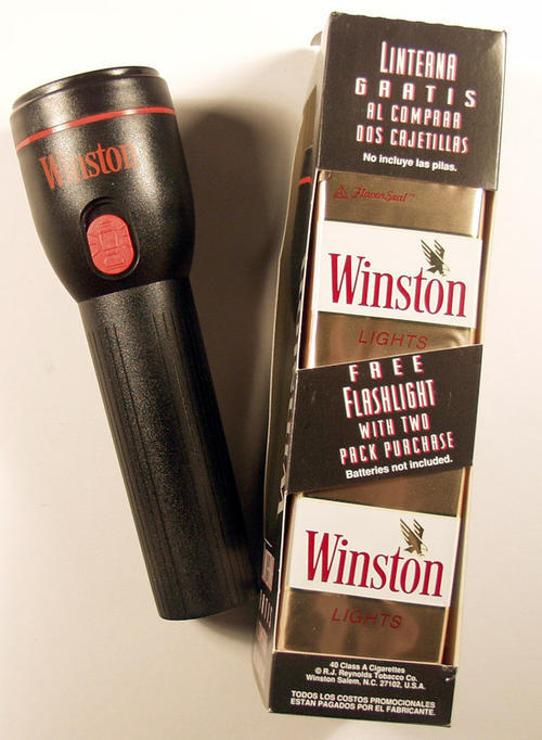 Two pack of winston lights in gold wrapping. Packaged with coleman black flashlight. One flashlight has loose parts shifting inside. Some labeling is in spanish.