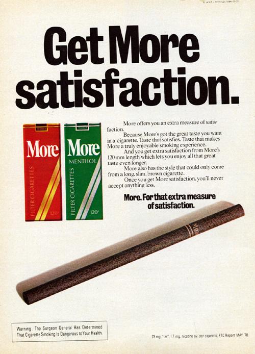 Ad for More found in Woman's Day June 26, 1979. "Get More satisfaction. More offers you an extra measure of satisfaction. Because More's got the great taste you want in a cigarettes. Taste that satisfies. taste that makes More a truly enjoyable smoking experience. And you get extra satisfaction from More's 120mm length which lets you enjoy all that great taste even longer. More also has the style that could only come from a long, slim, brown cigarettes. once you get More satisfaction, you'll never accept anything else."