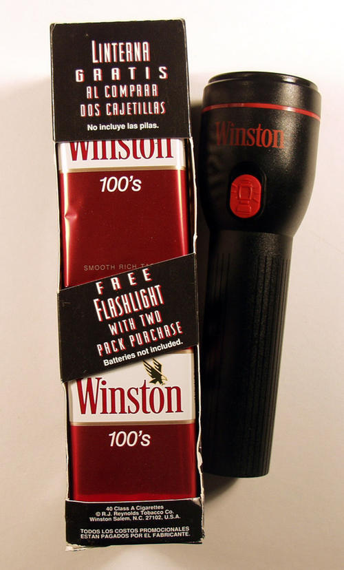 Two pack of winston with a promotional flashlight. Part of packaging is labeled in Spanish.