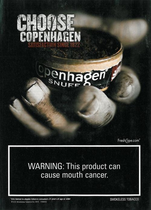 Ad from Copenhagen featuring a rough pair of male hands opening a can of snuff. Text: "Choose Copenhagen Satisfaction since 1822" Ad found in: Car and Driver: April 2015 GQ: June 2015