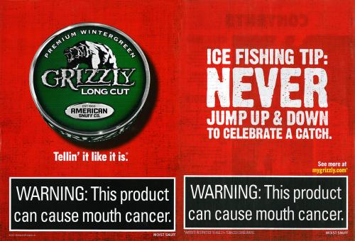 Magazine ad from Grizzly's "Tellin' it like it is" ad campaign promoting their Premium Wintergreen Long Cut product. Text: "Ice Fishing Tip: Never Jump up & Down To Celebrate a Catch."