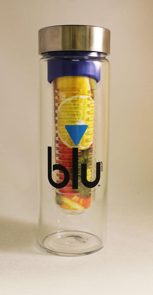 Water bottle with fruit defuser sent by blu when reward points were redeemed on the brand website. Package arrived in a plain brown box. Glass water bottle contains blu logo on front. Gift received in March 2015.