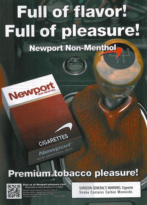 Ad for Newport non-menthol product next to the stick shift of a car. Includes a QR code to visit the brand website. Text: "Full of flavor! Full of pleasure!" and "Premium tobacco pleasure!"