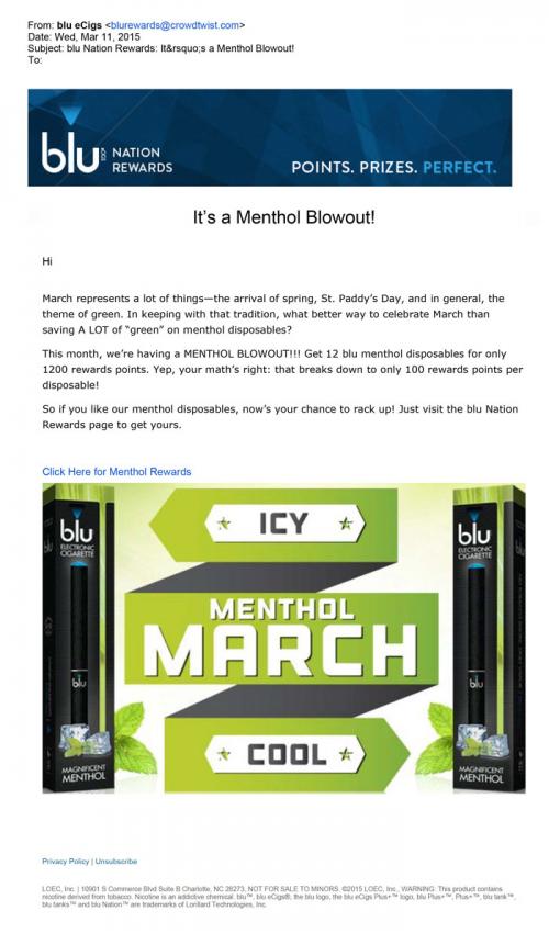 Email received from blu Nation Rewards March 2015. Email is informing recipient of the March Menthol Blowout! In honor of St. Patty's Day, users can redeem their reward points for 12 menthol disposables,