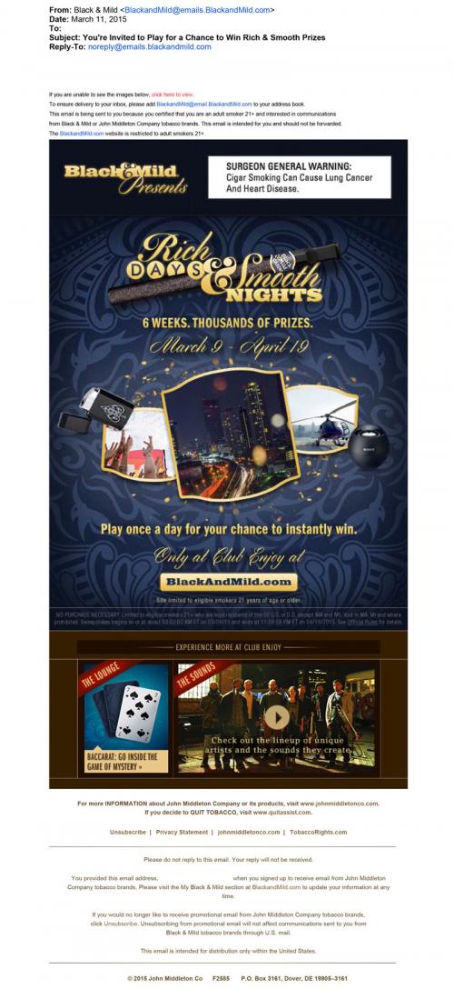 Email received from Black & Mild March 2015 informing recipient of the new Rich Days &Smooth Nights sweepstakes. Users can play daily for their chance to win thousands of prizes instantly.