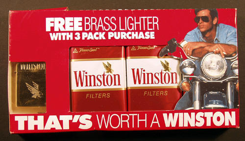 Three packs of Winston and free brass lighter. Brand loyalty catalog included inside.