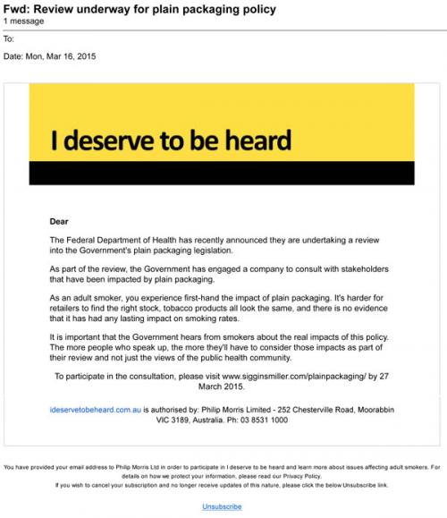 Australia's Federal Department of Health is currently reviewing the "plain packaging" legislation; Phillip Morris' "I deserve to be heard" project urges the recipient to let the Government hear how this policy will affect smokers.