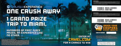 Direct mail from Camel received March 2015 informing recipient of the Crush Experience One Crush Away Sweepstakes. With hundred of first place winners and a grand prize to Miami it is "an experience like no other." The multifold piece also included 5 coupons for Camel cigarettes and one coupon for Camel Snus. Direct mail received in NJ and DC.