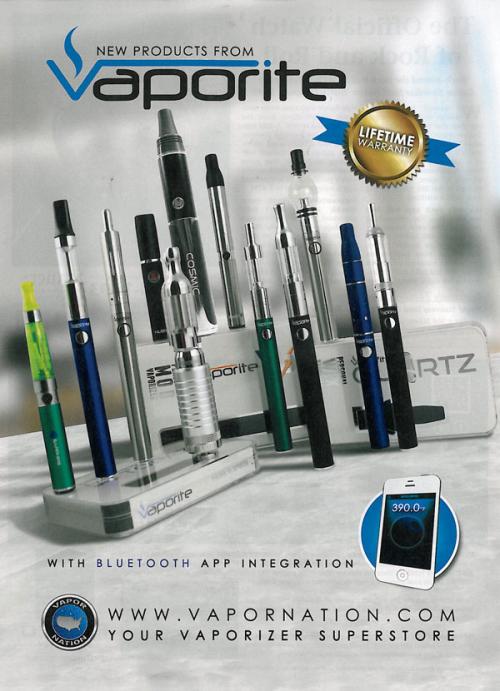 Magazine ad features new products with Bluetooth app integration from Vaporite. Ad invites readers to visit VaporNation.com, the online vaporizer superstore to purchase. Ad found in: Rolling Stone: April 9, 2015