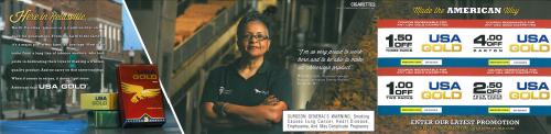 Direct mail received from USA Gold in March 2015 containing coupons the recipient requested online. The direct mail features second generation machine operator, Wanda Gunn and provides some history on USA Gold tobacco.