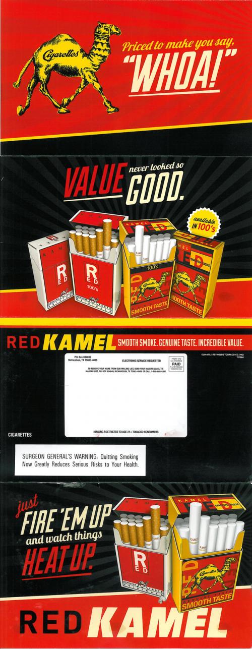 Direct mail from Red Kamel in November 2014 (received in Texas) containing coupons. Artwork has vintage style pin-ups. Slogans include, "The smoke that's SMOK'N!" "Value never looked so good." and "Just fire 'em up and watch things heat up." Also mentions the brand website.