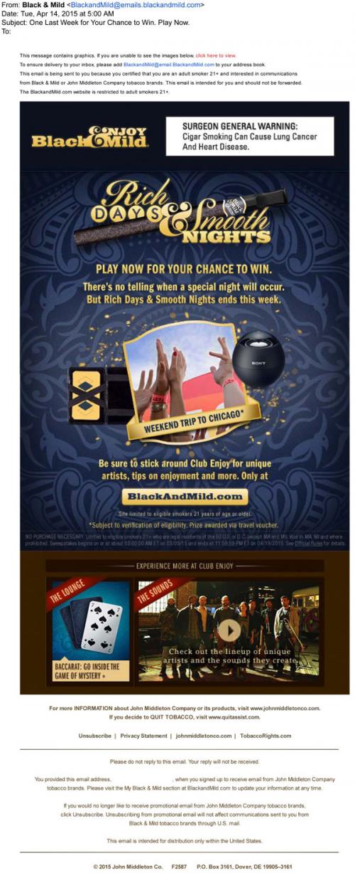 Black & Mild email reminder in April 2015 that their Rich Days & Smooth Nights sweepstakes ends this week. Invites the recipient to the brand website to enter to win this week's prize, a weekend trip to Chicago.