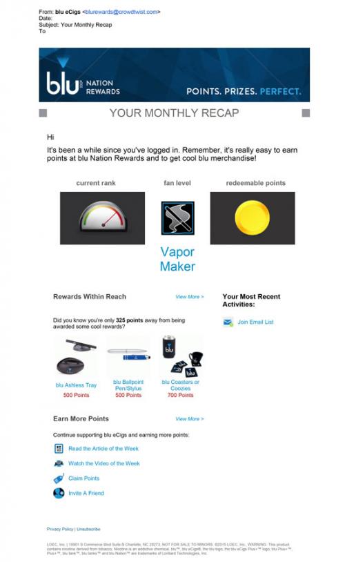 Email received from blu Nation Rewards April 2015 containing recipient's "monthly recap." Email contains current point balance, fan level, activity summary, rewards within reach and ways to earn more points.