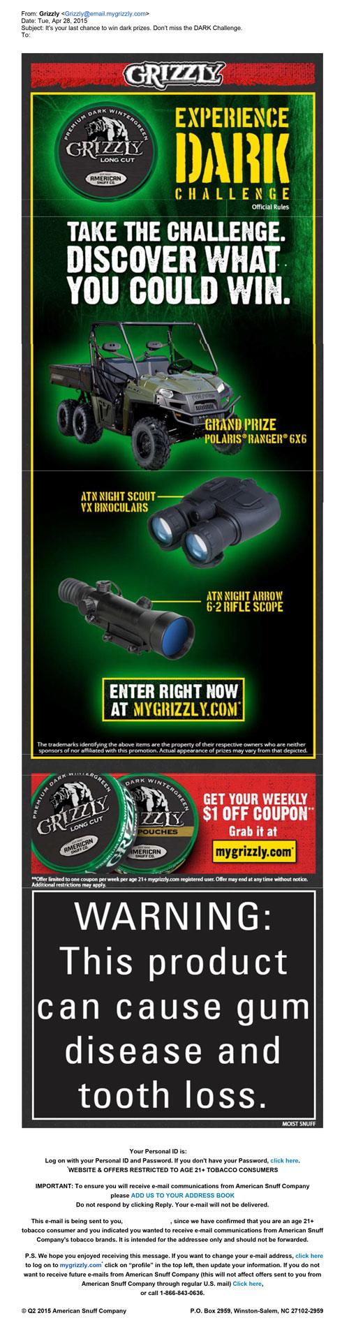 Email from Grizzly received on April 28, 2015 reminding recipient this is the last week to enter the Grizzly Experience Dark Challenge. Email features images of the possible prizes and invites user to brand website to enter the sweeps. Text: "Take the challenge. Discover what you could win." The email also reminds recipient to visit the brand website for their weekly coupon.