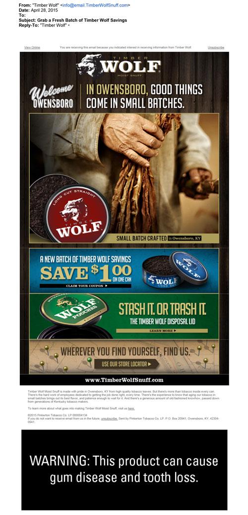 Email from Timber Wolf promoting their product's small-batch crafted quality. The email also includes a link to the brand website to claim a coupon, learn more about the "stash it or trash it," disposal lid and to find a retail store using the brand's store locator. Text: "In Owensboro, Good things come in small batches."