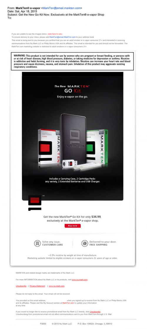 Email received form MarkTen April 2015 promoting the new GO Kit. The GO Kit includes a carrying case, 2 cartridge packs, 2 extended batteries and a USB charger. Exclusively only at the MarkTen e-vapor shop the recipient can purchase the Go Kit for only $34.99.