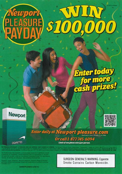Magazine ad for Newport's Pleasure Payday sweepstakes. Includes instructions on how to enter the contest at the brand website or by phone. Also has a QR code for use with mobile phones.